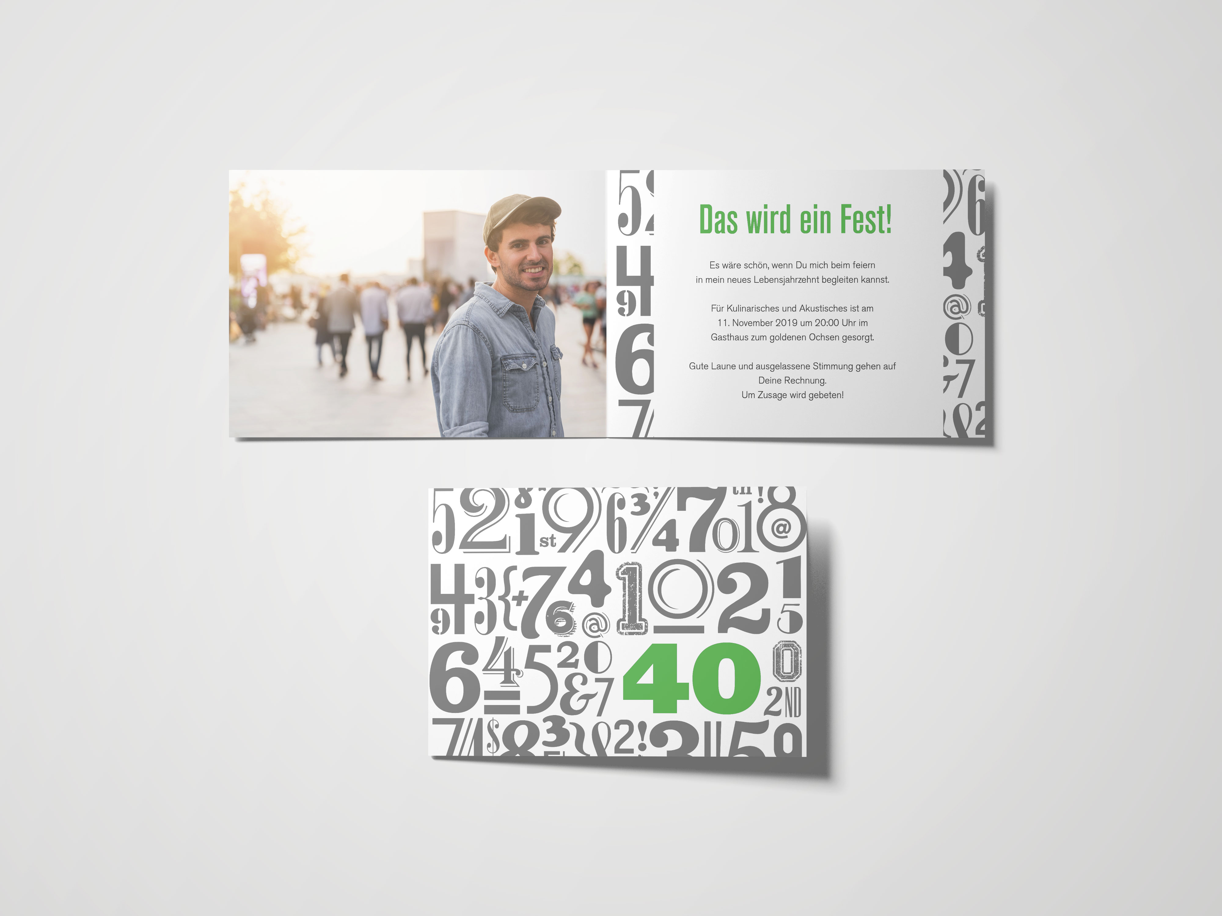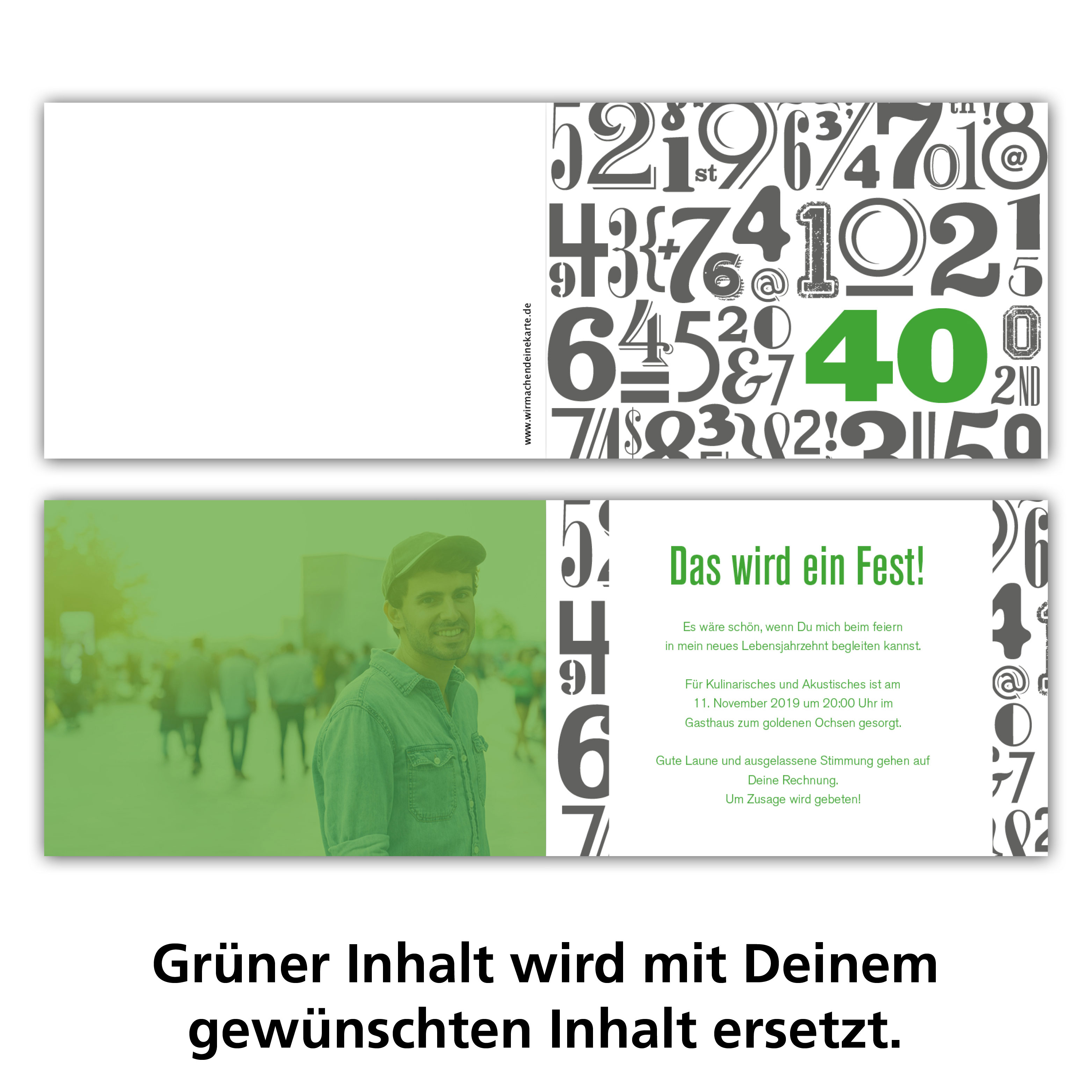 Du liebst Zahlen? Wir auch! Die Einladungskarte zum 40. Geburtstag Zahlenwolke rückt deinen runden Geburtstag ins richtige Licht. Alle Texte und Bilder der Karte werden für dich von unseren Grafikern in die Karte eingebaut und nach deinen Wünschen geändert. Bei uns bleibt kein Wunsch unerfüllt.