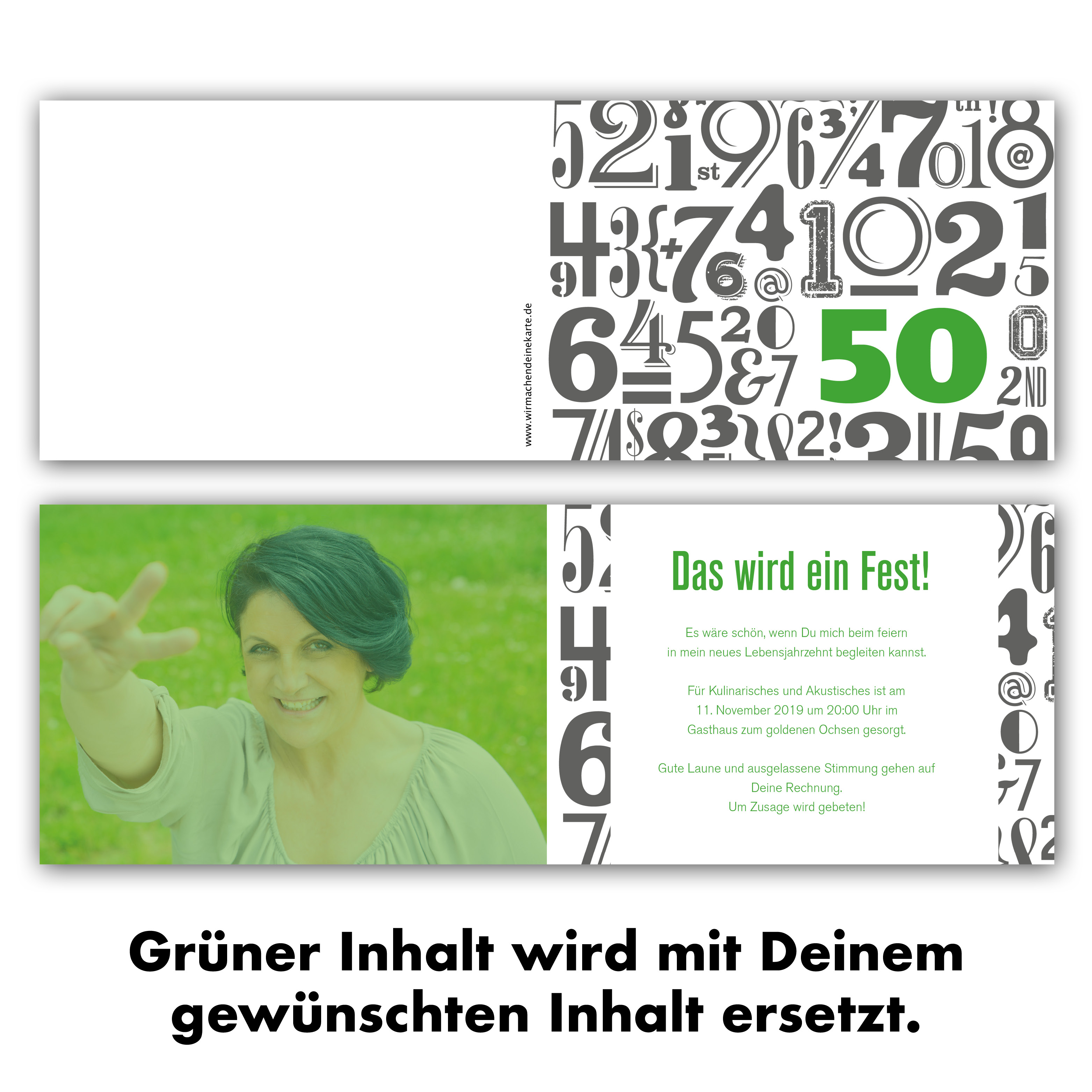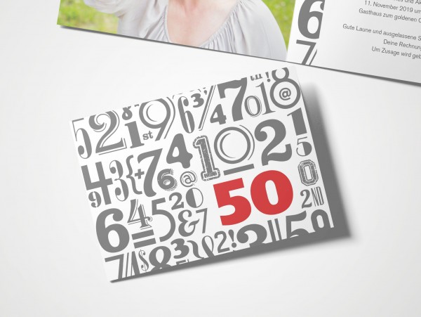 Du liebst Zahlen? Wir auch! Die Einladungskarte zum 50. Geburtstag Zahlenwolke rückt deinen runden Geburtstag ins richtige Licht. Alle Texte und Bilder der Karte werden für dich von unseren Grafikern in die Karte eingebaut und nach deinen Wünschen geändert. Bei uns bleibt kein Wunsch unerfüllt.