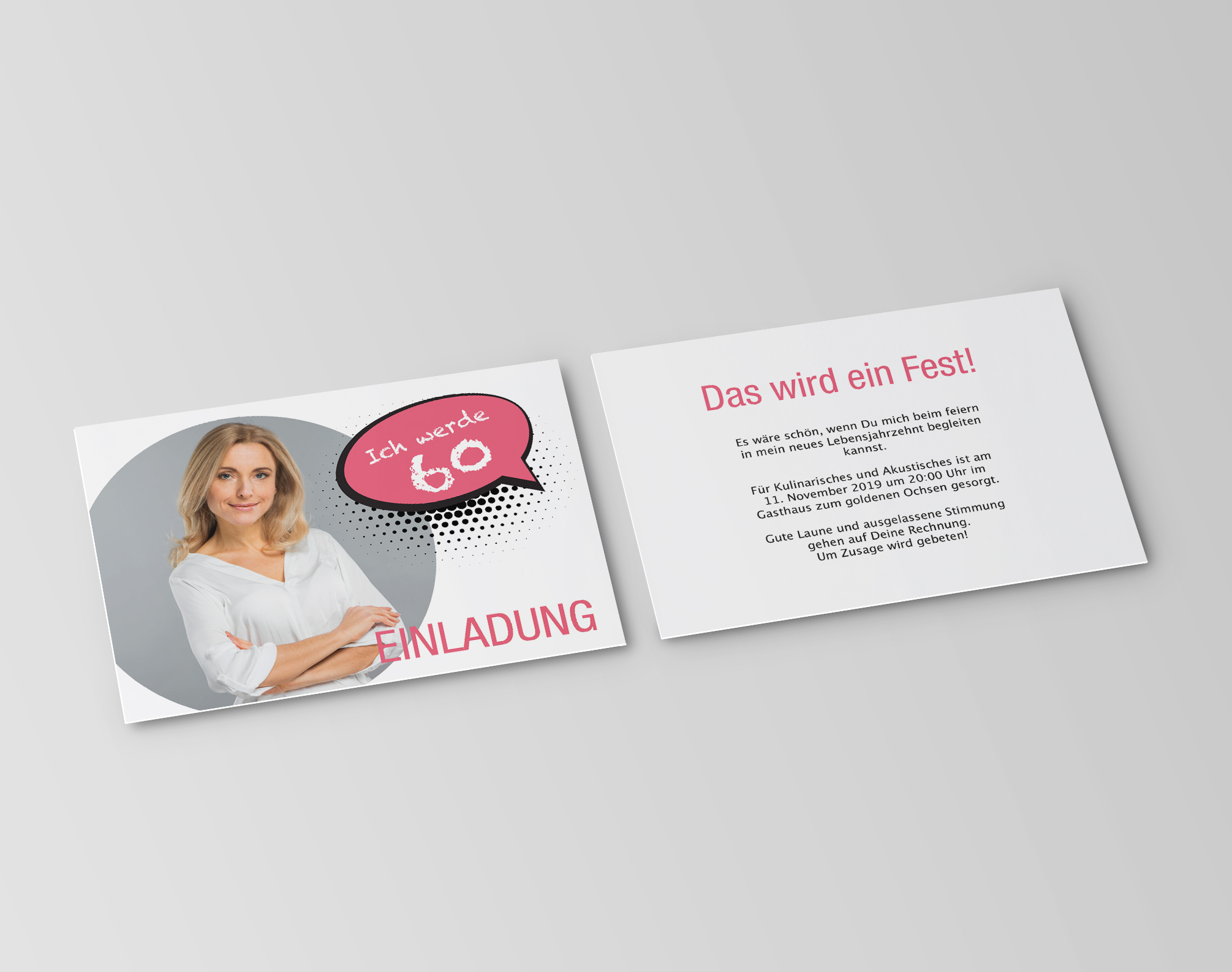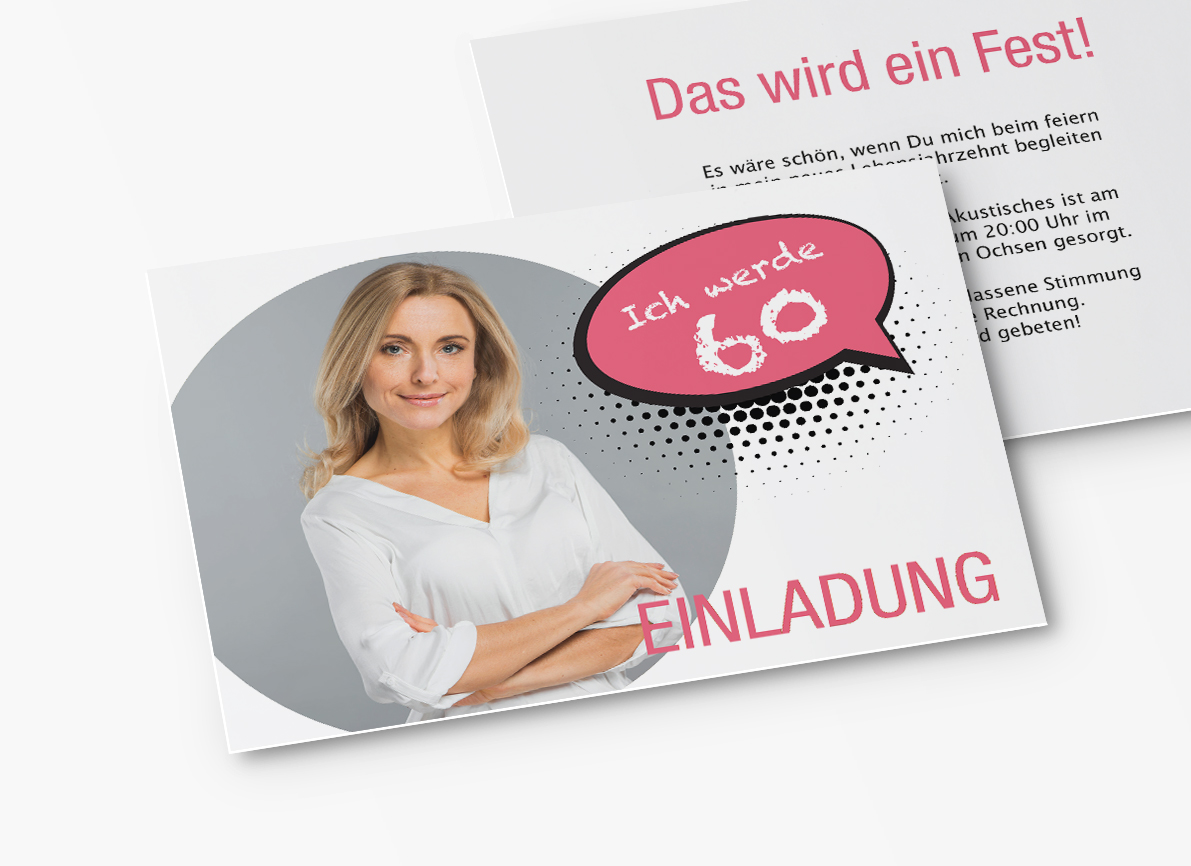 Du freust dich auf dein neues Lebensjahrzehnt? Dann ist die Einladungskarte zum 60. Geburtstag als Sprechblase genau das richtige für dich. Das Bild und die Texte werden von unserem Team für dich in die Karten eingearbeitet damit alles Perfekt wird. Ganz unkompliziert und ihne Stress.